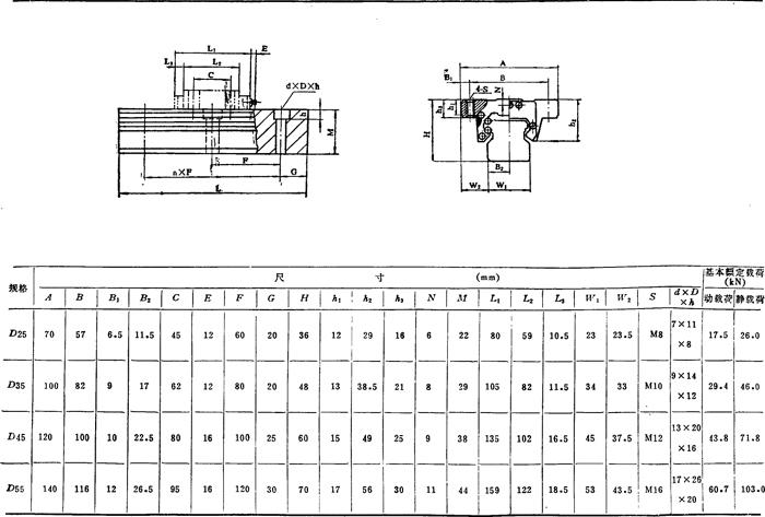 滚动导轨的几种主要结构见表4.20-12,几种国产滚动导轨块和滚动导轨副的尺寸系列见表4.20-13~4.20-16。
