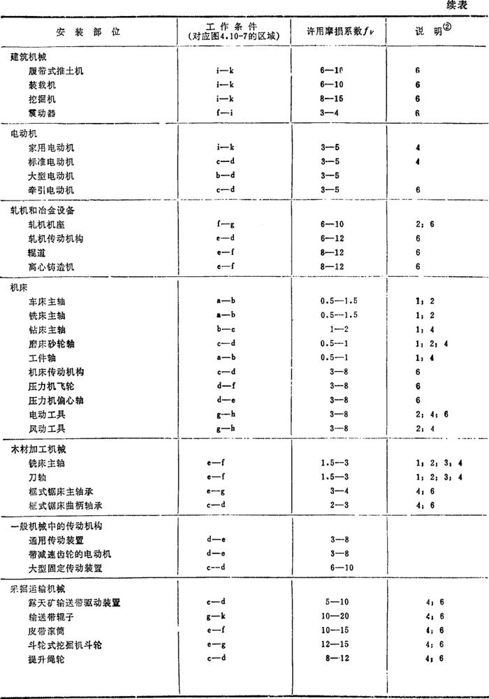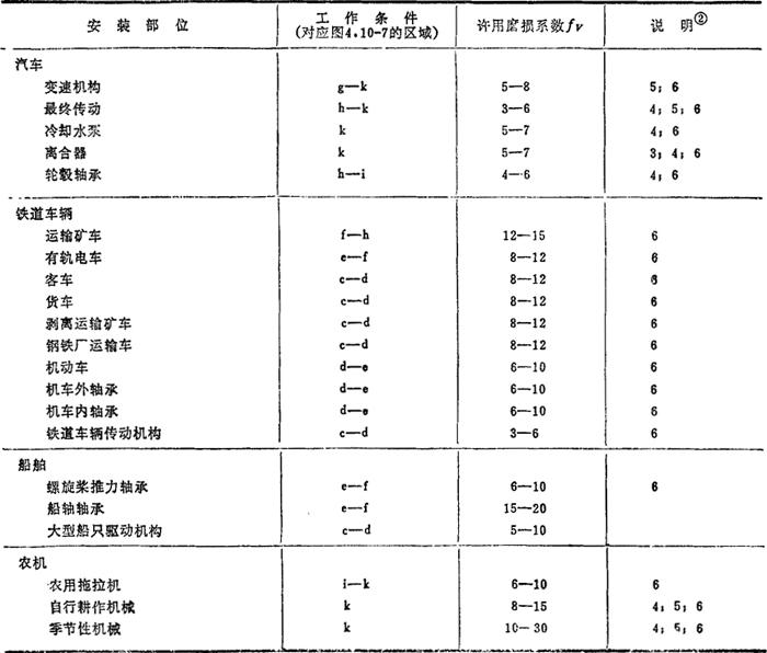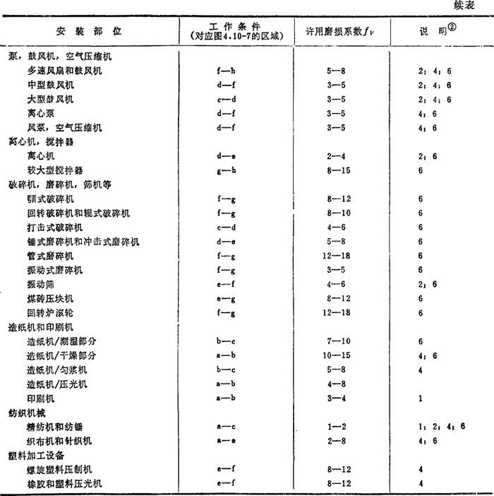 | 释义 | 滚动轴承磨损寿命的估算 轴承磨损的主要原因有:密封不佳、润滑不当或润滑油老化以及滚动面锈蚀等。随著磨损量的增加,轴承的游隙增大,运转精度降低,噪声增大。根据磨损极限而定出的轴承寿命,称为轴承的磨损寿命。通常根据磨损系数对磨损寿命进行估算〔33〕。磨损系数fV定义为: 表4.10-16 典型机械中轴承的工作条件和许用磨损系数