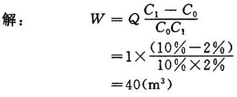 式中 W——稀释用水量(m3) Q——绝干纤维量(t) C0——稀释后纸浆浓度(%) C1——稀释前纸浆浓度(%) 【例】 某厂每小时生产绝干浆1000kg,由漂白塔送往真空洗浆机,漂白塔浓度为10%,送至真空洗浆机浓度为2%,问加入水量为多少?