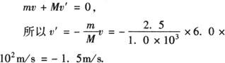 火箭是反冲运动的重要应用,它是靠喷出气流的反冲作用而获得巨大的速度的.现代火箭主要由壳体和燃料两大部分组成.壳体是圆筒形的,前端是封闭的尖端,后端有尾喷管,燃料燃烧时产生的高温高压气体以很大的速度从尾部向后喷出,火箭向前飞去. 例 一门旧式大炮,炮身的质量是M=1.0×103kg,水平发射一枚质量是m=2.5kg的炮弹,如果炮弹从炮筒射出的速度v=6.0×102m/s(对地),求炮身后退的速度. 分析 发射炮弹的过程,可以看做是炮身和炮弹相互作用的过程,炮弹和炮身受到的重力和支持力相互平衡,它们受的合外力零,系统的动量守恒. 解 发射前,炮弹和炮身都是静止的,它们的总动量为零,设炮弹从炮口飞出速度为v,炮身后退的速度为v′,以v的方向为正方向根据动量守恒定律可得  负号表示炮身后退速度与炮弹射出速度的方向相反,从而表示炮身得到“反”冲的速度.大小为1.5m/s. |