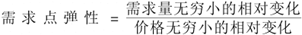 指需求价格曲线上某一点的弹性,表示在这一点上需求量对价格变化的反应程度,等于需求量无穷小的相对变化量与价格无穷小的相对变化量的比值,即,等于需求曲线斜率的倒数乘以价格与数量之比,用公式表示为,它随点在需求价格曲线上的移动而变化,在需求曲线的中点,点弹性等于1,从中点向左上方,点弹性大于1,到达纵轴截点时,点弹性为∞,从中点向右下方,点弹性小于1,到达横轴截点时,点弹性为0