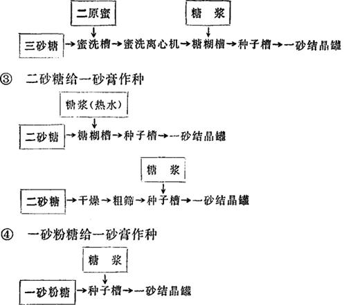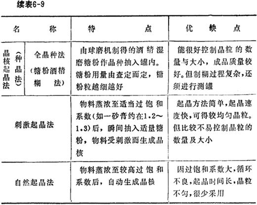起晶方法的种类及比较见表6-9。 表6-9 几种起晶方法的比较   注:利用小结晶罐起晶后再抽至大结晶罐中养晶的方法,在旧厂中仍有采用,但设备复杂,新建厂已不再采用 以下介绍种子法 1.种子法 种子法目前有: ❶ 三砂糖给二砂膏作种; ❷ 三砂蜜洗糖给一砂膏作种; ❸ 二砂糖给一砂膏作种; ❹ 一砂粉糖给一砂膏作种。 2.种糊制备 ❶ 三砂糖给二砂膏作种  ❷ 三砂蜜洗糖给一砂膏作种  调糊条件:Bx=85~89%,温度40~50℃。 要求:给一砂糖膏作种时,种子糖色值应不超过9°St,并不应有较多的并晶或叠晶。 3.种子法的优点 ❶ 由于缩短煮糖时间,可提高结晶罐生产能力达15%。 ❷ 由于低级糖不需溶化,减少起晶用汽等,可节约蒸汽量3%(对甜菜)。 ❸ 由于低级糖不需溶化,可减少复煮次数,从而减少蜜量;而当三砂糖不回溶至清净,可减少非糖分回头,可降低稀汁色值等。 ❹ 减轻煮糖操作难度(不需起晶),并能提高结晶糖粒的均匀性,减少并晶或叠晶。 |