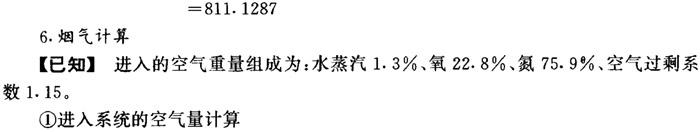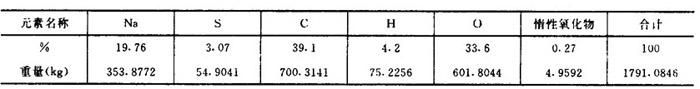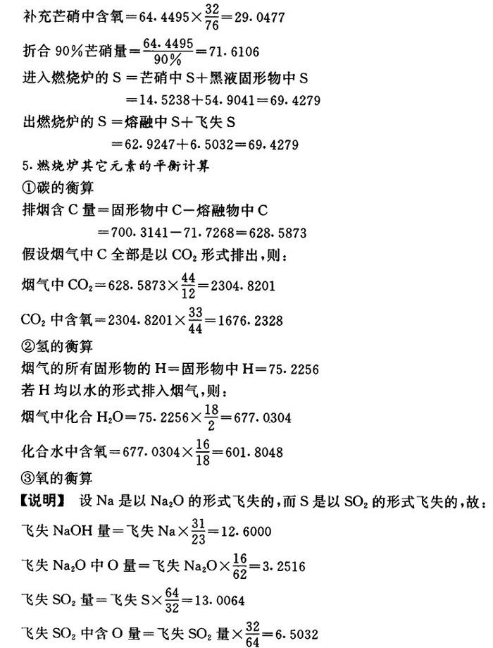 理论耗氧量=熔融物中氧+飞失Na2O含氧+CO2含氧+SO2中含氧 +化合水中氧—固形物中氧—芒硝含氧 =298.9501+3.2516+1676.2328+6.5032 +601.8048-601.8044-29.0477 =1955.8904 ❹ 惰性氧化物的处理计算 【说明】 固形物中惰性氧化物的量为4.9592kg。芒硝带入杂质量为7.161kg,共12.1203kg。设这些物质在燃烧时不起反应,直接进入熔融物中,然后在苛化中作为绿泥除去。 【计算】 熔融物量=Na2S+Na2SO4+Na2CO3+惰性氧化钠+芒硝杂质