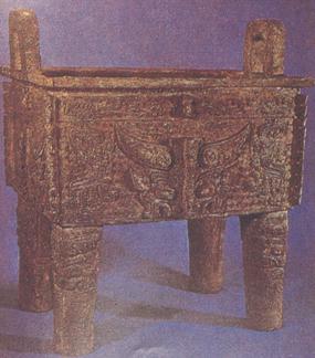 ◎礼器(炊器)/商代后期 1935年河南安阳侯家庄西北岗出土 通高73.3厘米 口长64.1厘米/台湾历史语言研究所藏 ●此鼎呈长方形,腹深平底,折唇。 两侧有立耳,腹底四角有略呈锥形四柱足。腹四隅有扉棱。 鼎以牛首为装饰,牛角占鼎身中间部位,粗而上扬;眼略小,呈长方形;鼻直长,口在鼎腹底沿,不甚明显。牛首两侧加饰立鸟,下为垂叶纹。 口沿下饰夔纹带。四柱足上亦饰牛首纹。 此器整体上方下圆,气壮力足,有力承千斤之势。 |