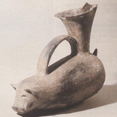 ◎陶塑/新石器时代(大汶口文化) 1974年山东胶县三里河出土 高18.7厘米 长21.5厘米 陶质/中国历史博物馆藏 ●鬶是古代陶制炊具,有流(出水口)、提手和三个空心足。 此鬶为夹砂灰褐色细陶,器身按猪的形态塑制。脊背平直,臀腹圆浑,短尾,足残失,颈部前伸,两耳前竖,两眼内凹有神,鼻端上翘,嘴横长微张,好似正在吃食的样子。器背塑有扁圆形的提手,臀部之上作有长颈漏斗状器口,口沿后部有仰起的流(已残损)。 整个造型单纯洗练,轻巧别致,手法细腻柔和,局部处理有虚有实,平中见奇。 猪的比例结构适当,神态憨直动人,使作品充满生气,饶有情趣,是件既有实用价值又有欣赏价值的作品。 |