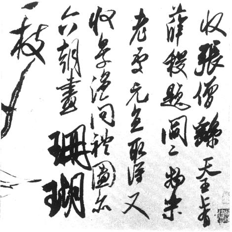 《珊瑚帖》在米书中又尤有特色。 “珊瑚”二字的夸张、书与画的并置,显示出米芾兴至处不拘成法的一面,但他毕竟技巧纯熟,烂漫处亦正是透出机关处。“珊”字对竪勾的处理,使人淸晰地感受到米芾用笔的运动特徵。 |