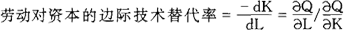 这一规律称为边际生产力递减规律或报酬递减律。它与规模报酬递减含义不同,但又有一定的关系。可以证明,当生产函数具有规模报酬不变或递减性质量,边际生产力必然递减。 (3)生产要素之间的替代率与替代弹性。生产一定数量的某种产品,可以使用不同的资本-劳动组合来实现,也就是说,生产要素之间具有替代性。 劳动对资本的边际技术替代率表示在产出量不变的条件下,增加一单位劳动可减少多少单位资本,其数值等于劳动的边际生产力对资本的边际生产力之比,用数学符号表示公式为: