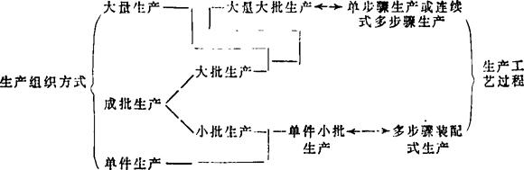 指工业企业生产按产品生产组织方式或工艺过程特点所做的分类。按生产组织方式,生产类型可分为大量生产、成批生产和单件生产三种。其中,成批生产可分为大批和小批两种。在生产组织方式上,大批生产接近于大量生产,小批生产接近于单件生产。按生产工艺特点,生产类型可分为单步骤生产(亦称简单生产)和多步骤生产(亦称复杂生产)两种。两种分类之间存在一定联系,一般地说,大量大批生产可以是单步骤生产,也可以是多步骤生产的连续生产,单件小批生产大都是装配式的多步骤生产。图示如下:
