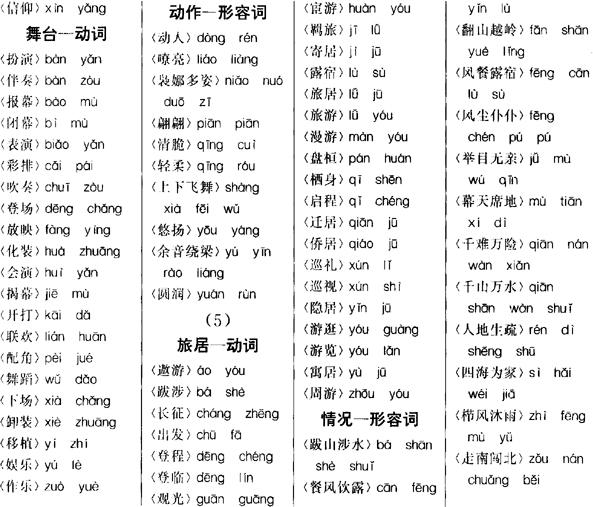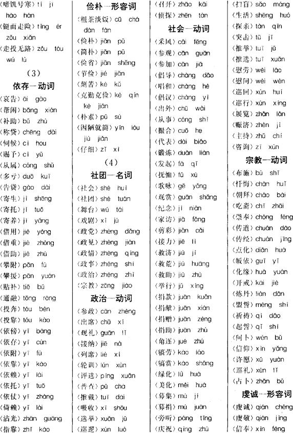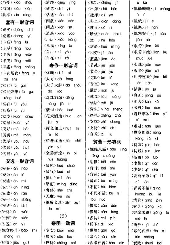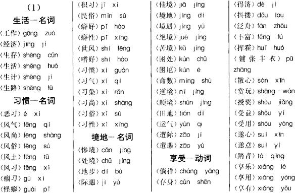 <--(1) 生活—名词 〈工作〉gōng zuò 〈经济〉jīng jì 〈生存〉shēng cún 〈生活〉shēng huó 〈生计〉shēng jì 〈生路〉shēng lù 习惯—名词 〈恶习〉è xí 〈风气〉fēng qì 〈风尚〉fēng shàng 〈风俗〉fēng sú 〈风土〉fēng tǔ 〈风习〉fēng xí 〈痼习〉gù xí 〈怪癖〉guài pǐ 〈积习〉jī xí 〈民俗〉mín sú 〈癖好〉pǐ hào 〈癖性〉pǐ xìng 〈世风〉shì fēng 〈嗜好〉shì hào 〈习惯〉xí guàn 〈习气〉xí qì 〈习染〉xí rǎn 〈习尚〉xí shàng 〈习俗〉xí sú 〈习性〉xí xìng 境地—名词 〈惨境〉cǎn jìng 〈处境〉chǔ jìng 〈地步〉dì bù 〈际遇〉jì yù 〈佳境〉jiā jìng 〈境地〉jìng dì 〈境遇〉jìng yù 〈绝境〉jué jìng 〈苦境〉kǔ jìng 〈困处〉kùn chǔ 〈困厄〉kùn è 〈命数〉mìng shù 〈逆境〉nì jìng 〈顺境〉shùn jìng 〈田地〉tián dì 〈运气〉yùn qi 〈遭际〉zāo jì 〈遭遇〉zāo yù 享受—动词 〈倘徉〉cháng yáng 〈存身〉cún shēn 〈得济〉dé jì 〈抖搂〉dǒu lou 〈泛舟〉fàn zhōu 〈丰富〉fēng fù 〈挥霍〉huī huò 〈铺张丰衣〉pū zhāng 〈散心〉sàn xīn 〈赏玩〉shǎng wán 〈授奖〉shòu jiǎng 〈受益〉shòu yì 〈受用〉shòu yòng 〈遂心〉suì xīn 〈遂意〉suì yì 〈踏青〉tà qīng 〈享乐〉xiǎng lè 〈享用〉xiǎng yòng 〈享有〉xiǎng yǒu-->