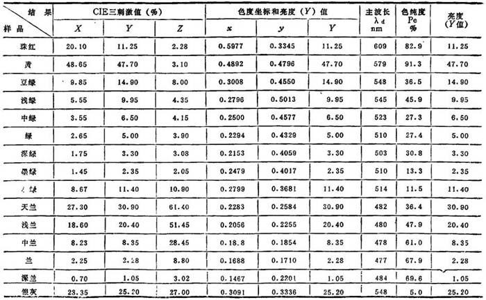 | 释义 | 生理物理的方法 这种方法是用物理的方法进行测定,但以生理的方法来解释。 在生理学中,三种感光体学说是与三基色原理相符合。这一学说假设人眼中有三组感光细胞,它们分别对红、绿、蓝三基色最为敏感。我们可以把眼睛作为接受器,对著三种不同的光谱敏感中心做一叙述,即人类眼睛的颜色感觉机能是不完全相同的。 1.标准观察者 在仔细检验了标准颜色视觉的人以后,国际照明协会(I.C.I或称C.I.E)于1931年综合了一个假定的标准观察者,即依据于一些有正常颜色鉴别能力的人,得到的平均颜色鉴别。标准观察者的三组感光细胞对不同波长颜色的灵敏程度可用三条光敏曲线(X红、Y绿、Z蓝)来表示,如图10—5—7所示。图10—5—8也说明了三种基本刺激的三刺激分布因素。 2.颜色的三刺激值 人们的各种颜料感觉都是由三组感光细胞所受到的三基色剌刺的不同比例和绝对值得出的。 图10—5—8说明了如何从决定颜色感觉的反射率坐标中得出三个标准颜色刺激的数值。在试验中,被观测的试样是由其反射率曲线〔R〕表示其颜色特性,并由具有一定光谱能量分布的光源〔E〕来照明。R×E表示在单一波长情况下进入眼睛的能量,即试样的反射率和光源的能量分布乘积。这个反射光能由眼睛的三组感光细胞按著它们的敏感性分别记录下来,传送到大脑后,产生得到颜色视觉的三个不同颜色刺激的量,在最后的图线上用面积表示。如果我们明确了眼睛的刺激坐标,并且用于照明的光谱成分是标准的,则得出的这三个面积其积分就可以分别计算出来。以此方法得出的三个数值称为标准颜色值或颜色三刺激值X、Y、Z。 3.X、Y、Z三刺激值的测定和计算 根据上述的人对颜色生理视觉的原理,人们采用物理方法对颜色视觉进行测量,其方法是,用光电色泽计测定试样对红、绿、蓝三基色光的反射率,分别以X、Y、Z表示,此三项数值亦相当于人的颜色生理视觉的三刺激值X、Y、Z。通过下式又可进一步计算出相对的三色系数,分别以x、y、z表示: 将曲线两端用直线连接起来,则所有实际的颜色都包含在舌形曲线和直线所包围的范围内,即任何颜色都可用这个面积内的一个点来表示,其色度由这个点的座标x和y来确定。 图中,无色点(白、灰)在中心,同色调但不同饱合度的颜色座落在无色点和谱色点之间的直线上。互补色在舌形图内互相对应。 如能求出任何颜色的X.Y.Z三刺激值,就能表示出其颜色。由X.Y.Z再求出色度座标x、y,并在色度图中标出其位置,则能更直观地辨别出颜色,但这还不能表示出颜色的明亮程度。为此,通常再加上一个表示亮度的Y值(即三刺激值中的Y刺激值),这样就可较全面地表示出一个颜色,例如,一黄色书皮纸的颜色测定结果为x=0.4428,y=0.494,Y=71.1%。 5.以主波长,色纯度和亮度表示颜色 前面曾提出颜色有三个特性,即色相(色调)、饱合度(深度)和亮度(明度、鲜艳度)。如果以颜色的这三个特性来表示某一颜色的测定结果,则会给人们以更具体的颜色印象。为此,通常还用主波长、色纯度和亮度三个值表示颜色。 (1)主波长 匹配某一样品颜色主要光谱色的波长为该颜色的主波长,以λd表示。主波长决定了试样呈现的颜色,如主波长600nm左右为红色、575nm左右为黄色、510nm左右为绿色、470nm左右为蓝色。颜色的主波长相当于日常生活中观察到的颜色色相(色调),为此用它表示颜色的色相特征。 (2)色纯度(饱合度或刺激纯度) 色纯度表示样品反射主波长光的比例,以Pe表示。纯度100%即表示只反射主波长的光线。色纯度即相当于颜色的饱合度(深度)特征,纯度越高,颜色越浓艳。 如表10—5—15中所列5种不同蓝纸的色纯度,天蓝、浅蓝、中蓝、蓝、深蓝等随著颜色的加浓,其纯度分别为36.4%,47.9%、61.0%,67.9%和69.6%。 (3)亮度 亮度在三刺激值中以Y(%)值表示,Y值越高,表示颜色越明亮。 (4)使用方法 主波长和色纯度可由CIE色度图求出,如在图10—5—10中,由光源点C通过某一颜色的坐标点连一直线,再延长使其与舌形曲线相交于M'点,M'点的波长509即是该颜色的主波长λd。CM线段与CM'线段之比即 如果由光源C通过某一颜色的x、y坐标点如N连成直线不能与舌形曲线相交,而与连接舌形曲线端点的直线相交于N',则该颜色没有主波长。这时将CN直线向相反方向延长使之与舌形曲线相交于N″,则N″点的波长称之为该颜色的补主波长,用λc表示。在CIE色度图中,通过光源点划直线两端与舌形曲线或直线相交的两个点,均表示互为补色的两个颜色。 以上均为CIE—XYZ测色制表示颜色的方法,可概括为三种方式,每种方式均由三个数值表示之: 表10—5—16为15种不同颜色的色纸对其颜色进行测定的结果,并分别以三种方式表示之。 表10—5—16