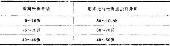 | 释义 | 用碱量和用水量 1.用碱量计算 在计算用碱量时,要注意所要求的游离松香含量、所使用的松香的皂化值,以及化学药品的纯度。熬胶时所需碱量可按下式计算: 4.用水量 熬胶用水量的多少决定了胶的浓度,并和松香胶中的游离松香含量有很大关系。游离松香含量高的胶料用水量少,以防止悬浮液产生分层情况。反之,含游离松香低的胶料,加水量可以多一些。表10—2—12示出游离松香含量与熬制胶料用水量的关系。 表10—2—12