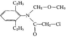 又称拉索、杂草锁、草不绿。 酰胺类内吸选择性除草剂。化学名称:a-氯代-2′,6′-二乙基-N-(甲氧甲基)乙酰替苯胺。 化学结构式如下。原药为乳白色非挥发性结晶体,熔点39.5~41.5℃,沸点100℃(2.67Pa),105℃分解。 24℃蒸气压293.3×10-5Pa。微溶于水,能溶于乙醚、丙酮、苯、氯仿、乙醇等有机溶剂。对紫外线稳定,在强酸、强碱条件下水解。能被植物幼芽(胚芽鞘或下胚轴)吸收,向上传导。种子和根吸收量少,传导慢。进入植物体内抑制蛋白酶,使蛋白质合成受阻,造成芽和根停止生长而死亡。 适用于大豆、花生、棉花、玉米、油菜、小麦及蔬菜等作物使用,防除多种一年生禾本科杂草和苋、藜等阔叶杂草,对菟丝子也有一定的防效。甲草胺对大鼠急性口服LD50为930mg/kg,兔急性经皮LD50为13300mg/kg,大鼠急性吸入LC50>1.04mg/L,对皮肤、眼有中等刺激作用。 大、小鼠致癌试验中,分别在15mg/kg和240~260mg/kg剂量下出现肿瘤,在美国列为限用型农药。