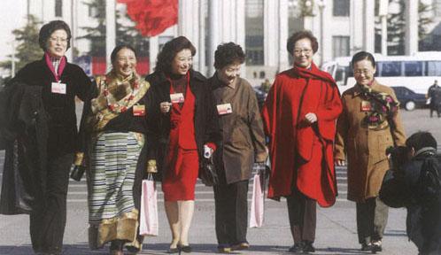 《中华人民共和国宪法》明确规定,“妇女在政治、经济、文化、社会和家庭生活等各方面享有同男子平等的权利。”“国家保护妇女的权利和利益,实行男女同工同酬,培养和选拔妇女干部。”“婚姻、家庭、母亲和儿童受国家保护。”“禁止破坏婚姻自由,禁止虐待老人、妇女和儿童。”依据宪法确定的原则,新中国陆续颁布了《婚姻法》、《选举法》、《继承法》、《民法》、《刑法》等10余部基本法,国务院及所属部委颁布了40余种行政法规与条例,地方政府制定了80余种地方性法规,这些法规都明确规定了保护妇女权益的条款。 任何一部中国法律都不存在对妇女的歧视性条款。中国政府还先后制定了《中国妇女发展纲要(1995~2000年)》和《中国妇女发展纲要(2001~2010年)》,明确了妇女发展的主要目标和任务。 中国政府除制定系列法规外,还积极参与国际妇女人权领域的活动,积极签署有关妇女国际人权法和国际文件,承担了促进妇女人权的责任和义务。如:1980年签署了《消除对妇女的一切歧视公约》,每年按时向国际机构递交公约执行报告;1985年签署了《到2000年提高妇女地位内罗毕前瞻性战略》,1990年加入国际劳工组织审议和制订的《男女工人同工同酬公约》等。  全国政协的妇女界委员 |