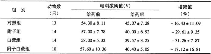 | 释义 | 白蔹 附子 【药理研究】 1.对体重、电刺激阈值的影响[1] 小鼠给以肥猪肉,鲜甘蓝,冷开水,连续8~9d,造脾虚模型。附子先煎120min,白蔹60min,合剂二药共煮60min,取3次滤液合并,浓缩液为100%附子、33.3%白蔹煎剂,及含药量与之相等的附子白蔹合剂。方法:10ml/kg/d×8灌胃给药;对照组给予同体积之蒸馏水。结果见表16-12-1,表16-12-2。 表16-12-1 白薇、附子及合剂给药前后体重变化(
