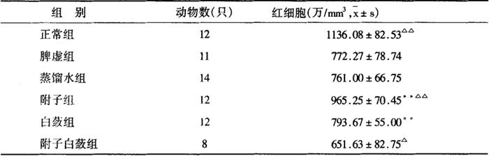 上表所列数据看出,二药单用或合用对体重的影响不明显;电刺激阈值均降低,尤以附子、白蔹组显著(P<0.01),合用后降低程度减弱。 2.对红细胞及血清蛋白的影响 将脾虚小鼠按前述方法分组,给药结束后,分别摘取眼球采血,生理盐水为稀释液,试管法记数红细胞数,并分离血清,将同组内2~4只小鼠的血清合并编号,用SBA-300型测定仪,双缩尿法测定其血清总蛋白、白蛋白及球蛋白的含量,经统计比较,结果见下表。 表16-12-3 附子、白薇及合剂对红细胞数的影响