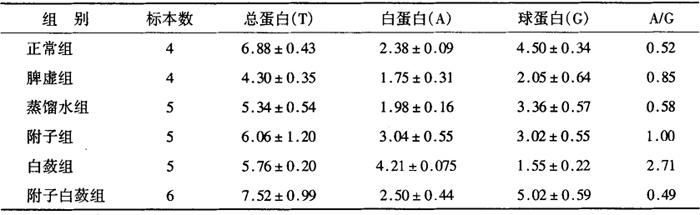 与蒸馏水组比较:△P<0.05,△△P<0.01;与合剂组比较:* *P<0.01 上表所列数据表明附子组红细胞的恢复较好,白蔹组不明显,二药合用后,降低显著(P<0.01)。从表16-12-4看,附子组、白蔹组,A/G之比例高于正常组,尤以白蔹组显著;合用后A/G值低于正常组。 表16-12-4 附子、白薇及合剂对血清蛋白含量的影响(g%,x±s)