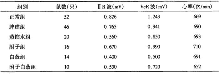 3.对心电图的影响 如前述分组方法给药8d后,用XDH-3型心电图机,针型电极,模拟人体标准肢导联和一个胸导联,在不麻醉的条件下,背位固定,测记各组动物的心电变化,统计各波电压变化,取均值作比较,结果见表16-12-5。 表16-12-5 附子、白薇及合剂对心电图测定的影响