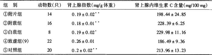 表16-12-5可见:附子组动物的二个导联的电压渐渐恢复,白蔹组的则较低;二药合用后,均较附子组低;心率的变化不明显,但合剂组稍慢,白蔹组、合剂组均有一例出现心律失常,揭示白蔹不论单用或合用对脾虚病模小鼠心电有一定影响。附子组动物的二个导联的电压渐恢复,白蔹组则较低,二药合用后均较附子组低,心率的变化虽不明显,但合剂组稍慢。 4.对小鼠肾上腺皮质功能的影响[2] 昆明种小鼠,体重21~29g,按上述饮食失节法造脾虚模型。药物如前法制成单味及合剂药物备用。致虚第9d,处死动物,取肾上腺(双侧)称量,同时按生物则定法测定双侧肾内维生素C含量。结果如下表16-12-6。 表16-12-6 给药后肾上腺指数及肾上腺内维生素C含量的变化