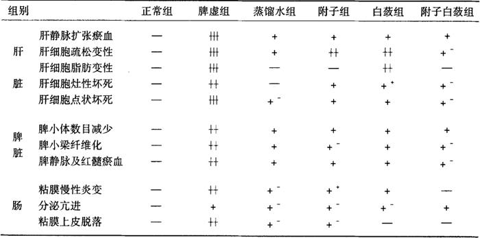 与❹ 比较:*P<0.05,* *P<0.01 由上表结果可知:附子有利于肾上腺指数的恢复。而与白蔹合用后,这一趋势有所降低。 5.对小鼠肝、脾、肠病理改变影响 报道1 肝脏:合剂给药组均较虚证组明显恢复。单用附子、白蔹较其他组又有较明显的病变,且病变重于蒸馏水组。脾脏:合剂组较对照组病变减轻。单用附子、白蔹组病变较重。肠:合剂组病变较轻,较单用附子、白蔹病变轻。 报道2 如前述分组实验,给药8d后,急性失血处死,解剖观察,取肝、脾、肠等部分组织,10%乙醇甲醛固定,石蜡切片,HE染色后封存,光镜下观察比较,结果见表16-12-7。 表16-12-7 对肝、脾、肠组织病变的影响
