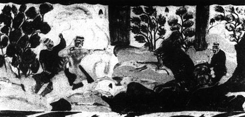 | 释义 | 睒子孝养父母 【作品赏析】: 这是根据《睒子经》绘制的故事画。 内容是:迦夷国有一孝子,名睒,十岁便随盲父母入深山学道,住茅屋、食野果、饮山泉,精心侍奉父母。一日,睒子披鹿皮衣在溪边取水,适逢国王入山狩猎,远望溪边有群鹿饮水,便引弓射箭,不幸一箭正中睒子。睒子惊呼:“一箭杀死三道人!”国王闻声赶来,惊问其故,睒子具说身世后而亡,国王便寻至盲父母处,表示万分悔恨。盲父母随国王来到溪边,抱著睒子尸体失声痛哭。 于是,天神感动,从空中撒下圣药而入睒子口中,睒子复活,盲父母也双目复明。 这个故事在莫高窟第299、301、302、417、438、461等窟均有表现,其中299窟窟顶的连续画描绘较为生动。 此图呈“凹”字形,位于藻井外围,共画了六个画面:1.画一宫殿,迦夷王与大臣对话;2.国王骑青花马,侍从骑马张伞随后;3.国王弯弓引射正在溪边取水的睒子;4.盲父母坐在茅庐内,国王跪于庐前陈述经过;5.国王引盲父母寻找睒子;6.盲父母抚尸痛哭,天神降药,睒子复活。 这幅画以连环画的形式,先是从左到右,从第四个情节开始转而从右到左,把国王射中溪边取水的睒子这一故事发展的高潮放在中段显要的位置上,突出了主题。 在气氛的渲染上,表现了国王弯弓欲射、马前三鹿飞奔、溪边三鹿回头惊望等急促、紧张的动态,与蹲在溪边取水的睒子安详的表情,以及旁边低头舐水的鹿子平静的神态形成鲜明对比,造成一种扣人心弦的危机感,增强了画面的感染力。 画家很注意人与环境的关系处理,山的作用,既作为人物的背景,又分割画面,造成既相联系又有相对独立性的画幅,虽然在表现上还是“人大于山”,却给人一种自然和谐的感觉。动物、树与山又分出不同层次,造成一种特有的空间感。山的画法富于装饰性,往往以石青、石绿分出层次带。 山头与山头之间,又交错以青绿、土红、黑等颜色,或以青绿山头与红色服装的人物相间,构成了富于变化的装饰趣味。又在山间绘以虎、鹿等动物,显得生机勃勃。。