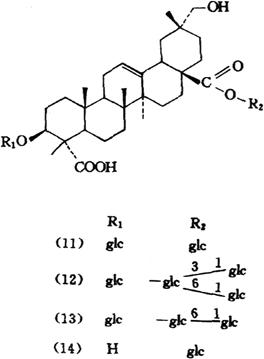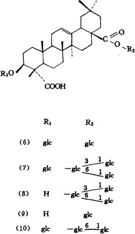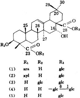| 释义 | 瞿麦 【概况】: 异名 巨句麦(《本经》),大兰(《别录》),山瞿麦(《千金方》),南天竺草(《圣济总录》),剪绒花(《医林纂要》),竹节草(《山东中药》)。 基源 为石竹科石竹属植物瞿麦或石竹的带花全草和根。 原植物 瞿麦Dianthus superbus L.,又名大菊蘧麦(《尔雅》),地面(《齐民要术》),红花瞿麦、野麦、木碟花、剪刀花、十样景(《中药大辞典》)。 历史 《本经》将瞿麦列为中品。 《本草经集注》谓:“瞿麦今出近道,一茎生细叶,花红紫赤可爱……子颇似麦,故名瞿麦。此类有两种,一种微大,花边有叉桠。……另一种叶广,相似而有毛,花晚而甚赤。”按所述,前者为瞿麦,后一种可能为石竹。 形态 多年生草本。 茎丛生,高30~60cm,无毛,上部2岐状分枝。叶线形至线状披针形,顶端渐尖,基部成短鞘,围抱节上,全缘。 花单生,或成对生枝顶,或成疏聚伞花序;苞片4~6,宽卵形,长约为萼筒的1/4;萼圆筒状,细长,长2.5~3.5cm,顶端5裂;花瓣5,淡紫色,顶端深裂成细线条,喉部有须毛;雄蕊10;花柱2,丝状。蒴果长筒形,和宿萼近等长,顶端4齿裂。 种子扁卵圆形,黑色,有光泽,边缘有宽于种子的翅。花期8~9月,果期10月。 (图见《中国高等植物图鉴》.第1册.644页.图1287) 石竹(lianthus chinensis L.(D.amurensis Jacq.)《中国药典1990年版》列入瞿麦项下,药材市场上也多将石竹作瞿麦入药。又名,鹅毛石竹(《洛阳花木记》),洛阳花(《纲目》),野麦、石柱花(江苏),十样景花(河北),东北石竹。 《纲目》载:“石竹,叶似地肤叶而尖小,又似初生小竹叶而细窄,其茎纤维有节,高尺余,梢间开花,田野生者,花大如钱,红紫色。人家栽者花稍小,而妖媚,有细白、粉红、紫赤、斑斓数色,结实如燕麦,内有小黑子。 ”所指即石竹。石竹与瞿麦形态特征的区别在于花瓣瓣片顶端浅裂成不规则牙齿状,萼筒长1.4~1.8cm,花萼下苞片顶端长尖,长约为萼筒的1/2或稍长;花萼裂片披针形,直伸,顶端尖,有缘毛。 花期5~9月,果期8~9月。 (图见《中国高等植物图鉴》.第1册.645页.图1289) 生境与分布 石竹与瞿麦均生于山坡、林下、山野草丛或岩石缝中。分布于中国各省区。 。【生药】: 栽培 宜温和湿润的气候,忌干旱。 对土壤选择不严,一般湿润而肥沃的壤土均能生长。用种子繁殖,春播在3月下旬~4月上旬,秋播于8月下旬~9月上旬,直播或育苗均可。直播,按行距27cm、株距17cm开浅穴点播或条播,每亩用种量0.75~1kg。 播后薄覆土,并浇水。 也可在秋、春季进行分株繁殖,将全株挖出,掰分成3~4株为1丛,以行株距各20~27cm开穴栽植。种子出苗后或分植后,须注意中耕除草和浇水。 每年结合中耕和收割,施追肥2~3次;冬季结合田园清洁进行培土壅根。 采集 夏、秋二季花果期割取地上部分,除去杂质,晒干。 药材主产于河北、四川、湖北、湖南、浙江、江苏。 鉴别 性状 石竹全长30~50cm。 茎圆柱形,有分枝,表面淡绿色或黄绿色,基部微带紫色,光滑无毛,节膨大,节间长3~7cm;质坚脆,易折断,断面中空。叶对生,线形或线状披针形,长3~5cm,宽约5mm。 枝顶有2~3个宿萼,黄绿色,表面具纵细纹,有时残存皱缩破碎的花瓣,棕紫或棕黄色,先端浅裂呈锯齿状,完整者,全花长约3cm,萼筒长约为全花的1/2;萼下有数枚小苞片,长约为萼筒的1/2,苞片先端呈尾状渐尖。气微,味淡。瞿麦与石竹的区别点为:花全长3~4cm,萼筒长约为全花的3/4;萼下小苞片长约为萼筒的1/4,苞片宽卵形,先端急尖或渐尖;花瓣先端细裂至中部呈丝状。均以色黄绿、穗及叶多者为佳。 显微 石竹叶的横切面:上下表皮细胞各1列,呈类长方形,外壁厚,角质层波状,气孔略突出;栅栏组织为2~3列细胞,海绵组织为多列细胞,有的含草酸钙簇晶,簇晶直径13~86μm,棱角钝圆;主脉维管束外韧型,韧皮部外侧有纤维束;侧脉维管束与主脉结构类同。叶表面观:下表皮细胞类长方形、类方形或类多角形,长27~112μm,宽29~67μm,垂周壁略弯曲或较平直,呈明显的连珠状增厚,表面有较粗的角质条纹,常弯曲,气孔突出,长圆形,直径14~27μm,副卫细胞2~3个,主为直轴式,也有不定式或不等式。 上表皮细胞垂周壁多平直,表面的角质条纹较细,较平直。 瞿麦叶的显微构造与石竹类同。(图见《中药志》.第4册.第2版.第772、773页.图740、741、742、743) 贮藏 置通风干燥处。 。【化学】: 瞿麦(Dianthus superbus L.)鲜草含水份77.3%,粗蛋白质2.62%,无氮浸出物13.13%,粗纤维4.95%,粗灰分11.09%,磷酸0.13%[1];原维生素A类物质[2],皂甙。 花中含挥发油[3]。全草尚分出荭草素(Orientin)、异荭草素(Homoorientin)多种黄酮类化合物[4]。 最近从全草中分离得到4个环肽,已鉴定其中二个为新的环六肽——瞿麦环肽A及B(Dianthin A,B)[5]。 石竹(D.chinensis L.)花含芳香油,主要成分为丁香酚(Eugenol)、苯乙醇(Phenyl ethylalcohol)、苯甲酸苄酯(Benzyl benzoate)、水杨酸苄酯(Benzyl salicylate)、水杨酸甲酯(Methyl salicylate)[3][6]。 全草含石竹皂甙A(1)、B(2)[7]、C(3)、D(4)(Dianchinenoside A、B、C、D),海南冬青皂甙(Hainanenside)(5)、异红草素-2″-葡萄糖甙(Isoorientin 2″-0-glucoside)、异牡荆素-2″-葡萄糖甙(Iso-vitexin-2″-O-glucoside)、金圣草酚-7-葡萄糖甙(Chrysoeriol-7-O-glucoside)、胡萝卜甙(Sitosterol-3-β-O-D-glucopyrancsidc)[8]。 附:长萼瞿麦(D superbus var.longicalycinus Will.)、全草含瞿麦皂甙A(6)、B(7)、C(11)、D(12)、E(13)、F(14)、G(8)、H(9)、I(Dianoside A、B、C、D、E、、F、G、H、I)、赤小豆皂甙Ⅸ(Azukisapcnin Ⅳ)