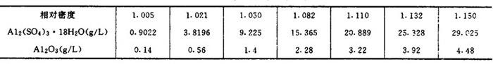 | 释义 | 矾土溶液中标准硫酸铝含量的近似计算 【说明】 在室温(15℃)下,标准硫酸铝(矾土)按含18个结晶水计。 【公式】 C1=90(d2-1) (1-13-4) C2=0.153C1 (1-13-.5) 式中 C1——矾土浓度(g/L)[以A12(SO4)3·18H2O计] d——溶液相对密度 C2——氧化铝浓度(g/L)(以A12O3计) 【例】 求相对密度为1.087的矾土溶液中含标准矾土及氧化铝的量。 解: C1=90(1.0872-1) =16.3412(g/L)[以A12(SO4)3·18H2O计] C2=16.3412×0.153 =2.5(g/L)[以A12O3计) 【附表】 矾土液中标准矾土及氧化铝含量速查表见表1-13-1。 表1-13-1 标准矾土及氧化铝含量速查表