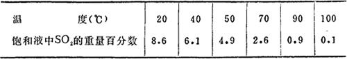 硫磺(S),比重2.0,熔点114~119℃,沸点444.5℃,著火点275~280℃。 生产用硫磺应含: S 98%以上 水分 1%以下 砷 0.05%以下 灰分 0.1%以下 硫磺燃烧后生成二氧化硫即: S+O2→SO2 +2500千卡/公斤 32+32→64 每燃烧一公斤硫,得两公斤二氧化硫气体,需氧气一公斤或 米3(1.429氧气重度),理论空气消耗量 =3.33米3(21空气中氧的体积含量%)。 SO2气体的体积,等于进入反应的氧的体积,在理论空气耗量下,二氧化硫在气体中的含量(体积百分率):  硫磺燃烧时过量空气系数为1.5~2.0,实际SO2含量为10~15%。 SO2是无色气体,易溶于水,溶于水后生成亚硫酸,具有强腐蚀性,溶解度随SO2的分压大小而增减,随温度升高而降低,在标准压力下SO2在水中的溶解度见表4-66。 表4-66 SO在水中的溶解度  |