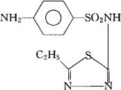 C10H12N4O2S2=284.35 CAS-94-19-9 4-氨基-N-(5-乙基-1,3,4-噻二唑-2-基)苯磺酰胺。 4-Amino-N-(5-ethyl-1,3,4-thiadiazol-2-yl)benzenesulfonamide. N1-(5-乙基-1,3,4-噻二唑-2-基)对氨基苯磺酰胺。 N1-(5-Ethyl-1,3,4-thiadiazol-2-yl)sulfanilamide. 磺胺类药。 Sulfaethidole,Sulphaethidole,Solflidolo,Aethazolum. INN,NF,DCF,DCIT,USAN,MI.  |