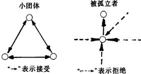 | 释义 | 社会关系图评法 社会测量法的一种。 该方法是提出若干问题,让被试在其团体内自愿选择。如:“你最愿意和谁一块学习?”,“你最愿意和谁一块看电影?”编制和施测时,应注意项目以及选择数目不要过多。项目要具体、切合实际、并易于为被试了解。要限定团体的范围、说明目的并告诉被试他们的选择将不为外人所知,以打稍顾虑。结果的整理方式有二:一是列表;二是图示法,此法更常用、故称社会关系图解法。如下图: