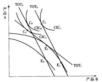 | 释义 | 福利恶化型增长 由于大国能通过贸易来影响商品相对价格比率,所以要素禀赋的增长和技术进步就不仅从生产和消费上对贸易发生影响,而且也能通过改变贸易条件来影响贸易和福利。 当增长所造成的贸易条件恶化效应要超过增长所带来的福利增加效应时,就会造成所谓“福利恶化型增长”。埃奇沃思(Edgeworth)首次指出了这种可能性。巴格瓦蒂(J.Bhagwati)在其1958年的《福利恶化型增长:一个几何注解》一文中对之进行了形式化的分析并命名。我们可以用一个简单的图形来表示这种情形。 如图中,增长之前该大国的生产可能性曲线为PPF0,假设现在劳动力禀赋增加,PPF0变动为PPF1,如果现在贸易条件(TOT)保持不变,仍为TOT0那么新的生产点在E1,新的消费点在C1,增长后该国的社会无差异曲线(CIC)由CIC0提高到CIC1,是为增长的福利效应(welfare effect)。而现在由于该国为大国,劳动力增加使该国能够出口更多的劳动密集型产品B,故在国际市场上B的价格会下跌,引致该国的贸易条件恶化为TOT1,在这样的贸易条件下,生产点为E2,消费点为C2,所达到的社会无差异曲线CIC2甚至比增长前还要低。 换言之,增长反而使该国的福利恶化了。