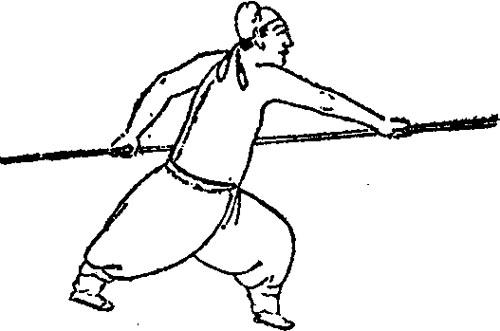 传统棍术动作。明程宗猷《少林棍法阐宗》载:“秦王跨剑势,提金翻棍挤进怀,秦王跨剑棍紧挨。”
