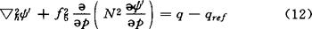把q表示成地转流函数 其中φref(p)为参考位势,通过线性化的静力关系 其中R=R(p)=dπ(p)/dp。 把(13)和地转近似