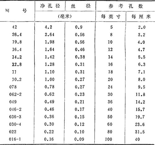 常用4、8、14和16号等几种筛网。 表6-71为国内一般用金属丝网的规格。 表6-71 国内一般用金属丝网规格
