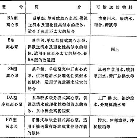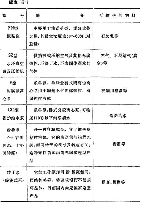 表13-1 糖厂常用的各类泵