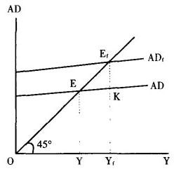 “膨胀性缺口”的对称。 当实际总需求低于充分就业总需求时,实际总需求与充分就业总需求之间就产生差额。在下图中,横轴代表国民收入,纵轴代表总需求,45°线上的任何一点表示总需求等于国民收入,即国民收入的均衡。 充分就业的国民收入为OYf,实现这一国民收入水平所要求的总需求,即充分就业总需求是ADf。但现在实际总需求为AD,它所决定的国民收入为OY。这时,实际的国民收入小于充分就业的国民收入,实际总需求小于充分就业总需求。充分就业总需求与实际总需求之间的差额,即图上的EfK,就是紧缩性缺口。 根据凯恩斯主义的观点,当经济中存在紧缩性缺口时,会由于总需求不足而引起失业。因此,这时应采取扩张性财政政策与货币政策,以刺激总需求,消除失业。 参见“膨胀性缺口”。