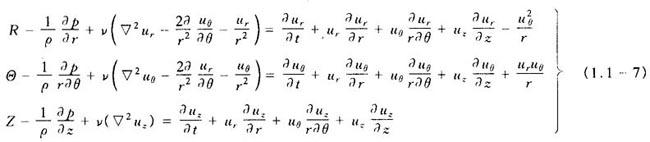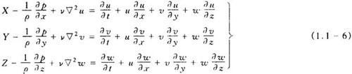 纳维—斯托克斯方程就是粘性不可压缩流体动量守恒的运动方程,简称N-S方程。该方程概括了粘性不可压缩流体流动的普遍规律,因此具有特别重要的意义。 (1)矢量式  式中 ▽2——拉普拉斯算子,在直角坐标系中为  v——流体的运动粘度; Fm——质量力; p——流体各向同性压力; v——流体速度矢量。 (2)直角坐标系标量式  式中 X,Y,Z——单位质量的质量力在x,y,z方向的分量; u,v,w——速度矢量v在x,y,z方向的分速度。 (3)圆柱坐标系标量式  式中 R, ,Z——单位质量的质量力在r,θ,z方向的分量; ▽2——拉普拉斯算子,在圆柱坐标系中为  以上三组方程,若不计粘性的作用,即设v=0,则可得到相应的理想流体的运动微分方程式,即欧拉运动微分方程。 |