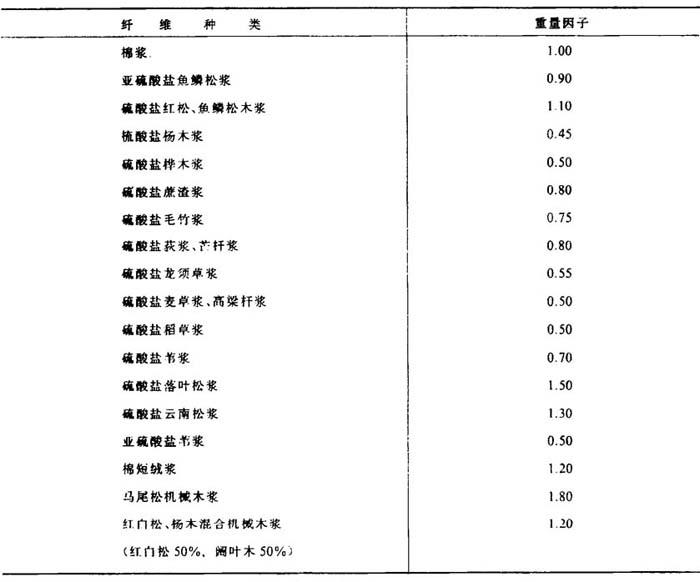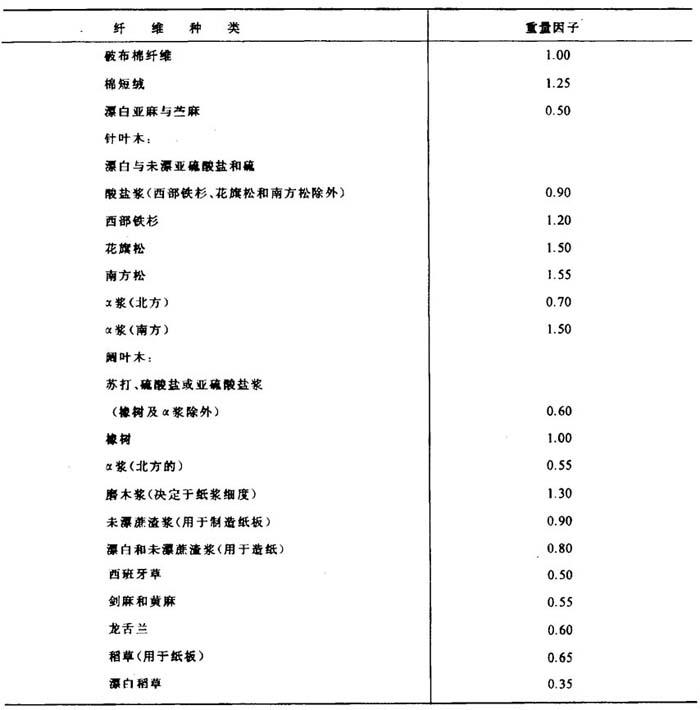 [说明]纸与纸板纤维种类组成的测定原理是用显微镜观察各种纤维对染色试剂的颜色反应及各种纤维的形态特征,来鉴定纤维的种类并测定不同纤维含量的重量百分率。纤维配比的测定方法有估计法和计算法两种,以计算法较准确,但速度较慢。 [测定方法]执行GB4688-84(国家标准局1984-09-29发布,1985-07-01实施)。 [应用仪器]显微镜、载波片及盖玻片,解剖针和镊子、纤维分散设备、过滤器、特制滴管、烘干设备、特种铅笔等。  式中 x。-各种纤维配比(%) f1、f2……fn-各种纤维的重量因子,即纤维单位长度的相对重量,见表3-4-2和表3-4-3 表3-4-2 国内纸浆纤维的重量因子  注:由轻工业部造纸工业科学研究所提出 表3-4-3 TAPPI标准采用的重量因子(供作进口浆分析参考)  N1、N2……Nn-各种纤维通过目镜“+”字测微尺的数目 |