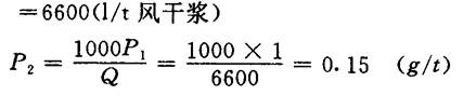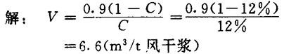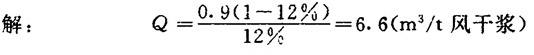 式中 V——每吨风干浆带走的残液量(m3/t风干浆) C——洗后纸浆浓度(%) 【例1】 某厂洗后纸浆浓度为12%,求每吨风干浆带走的残液量。