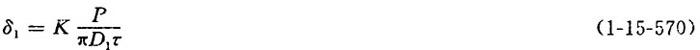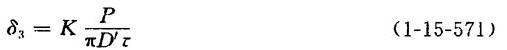 式中 D——辊轴外径(m) d′——锁片销内径(m) P——剩余总压力(N) δ压——抗压许用应力(Pa) K——常数 4.压盘厚度δ 【说明】 压盘在纸粕辊中主要受力是锁销时与销子接触之处所受的剪切力。其尺寸是由内圈厚度δ1和台肩高δ2组成。 【公式】 δ=δ1+δ2 (1-15-569) 式中 δ——压盘厚度(m) δ1——压盘内圈厚度(m)