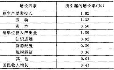 | 释义 | 经济增长因素分析 运用经济计量学的方法,并根据实际经济统计资料,对影响经济增长的各种因素在经济增长中贡献大小的定量分析研究。 在50年代后期,美国经济学家R.索洛根据美国1909~1940年的经济统计资料计算出,在这一时期,每年平均增长率为2.9%,其中资本积累所做的贡献是0.32%,劳动的增加所做的贡献是1.09%,技术进步所做的贡献是1.49%。在60年代,美国经济学家J.W.肯德里克根据美国1889~1957年的经济统计资料计算出,在这一时期,每年平均增长率为3.5%,其中资本积累和劳动增加(即生产要素投入量的增加)所做的贡献是1.8%,技术进步(生产率的提高)所做的贡献是1.7%。 以后,美国经济学家E.F.丹尼森根据美国1929~1969年的经济统计资料进一步分析了各种生产要素和技术进步(用每单位投入的产出量来表示)对经济增长的贡献。他的结论可用下表概述: 以上研究不仅具体分析了各种影响经济增长的因素在经济增长中的具体作用,而且都强调了技术进步对经济增长的重要作用。丹尼森等人还对美国、西欧和日本各种增长因素在经济增长中做出的贡献进行了比较,以便为加速美国的经济增长寻求途径。参见“增长理论”。