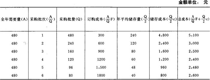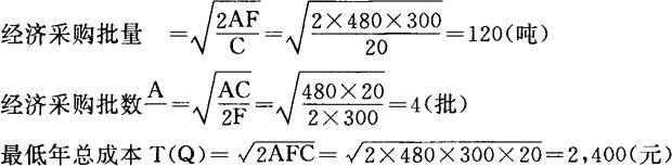 仍以前面举例的资料说明经济采购批量、经济采购批数以及最低年总成本计算方法: