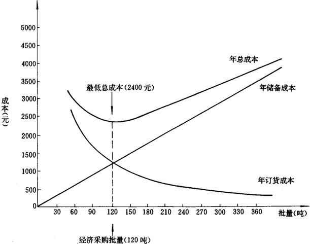 经以上逐批测算,从测算表中可见,当全年订货4次,每次订货120吨时,其存货总成本为2,400元。当采购批量低于或高于120吨时,其总成本均高于2,400元。因此120吨为总成本最低的采购批量,即经济采购批量。 (2)图解法 图解法也称为图示法,是将不同采购批量的年订货成本、储存成本及总成本描绘在同一直角座标图中,以总成本曲线的最低点,即订货成本线与储存成本线相交点相对应的采购批量,作为经济采购批量的一种方法。 以上述举例中有关资料,绘制经济采购批量图式如下。