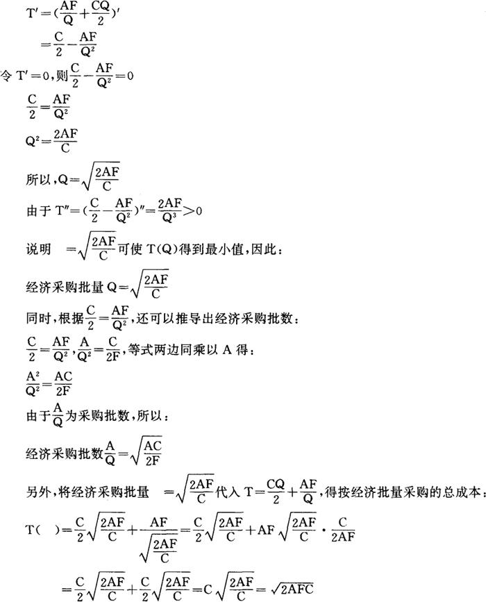 由上图可以看出,当存货年总成本曲线为最低点时,也就是年储存成本线与年订货成本线相交时的年总成本。此时的年总成本为2,400元,相对应的采购批量为120吨。因此经济采购批量即为120吨。 (3)公式法 公式法是根据采购批量与年订货成本和年储存成本之间的关系,通过建立数学模型来确定经济采购批量的一种方法。