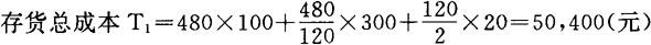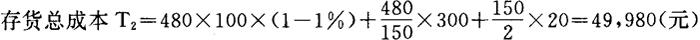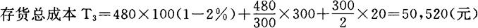 例:上述举例中,甲材料全年耗用480吨,每吨价格为100元,每次订货成本为300元,每吨年储存成本为20元。现假定供货单位规定,一次订货超过150吨,可给予1%的批量优惠,一次订货超过300吨,可给予2%的批量优惠。试对甲材料的订货批量进行决策。 下面三种不同订货方案的存货总成本分别计算如下: ❶ 按经济批量采购,不取得数量折扣的存货总成本: