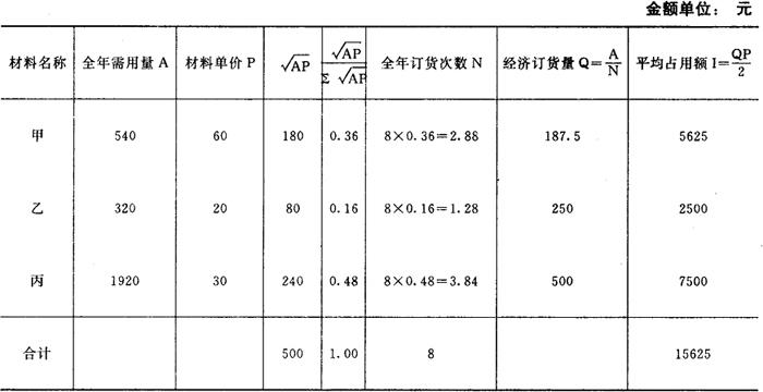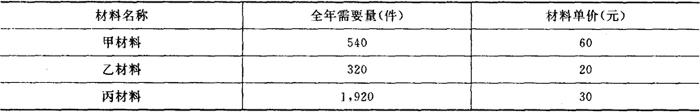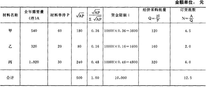 通过以上对三个采购方案总成本的计算和比较,可以看出采购批量为150吨时,存货的总成本为最低。因此,在决策时应选择批量为150吨,数量折扣为1%的最优采购批量方案。 (2)资金限制条件下的存货采购批量决策 企业在生产经营活动中,投资在存货上的资金总是有一定限度的。企业生产经营所需要的存货,不但种类繁多,而且各种存货所需要的数量多少不等。如果企业在一定时期内用于各种存货的资金平均周转额规定有特定的限额,那么存货的采购就不能按照各种存货的经济批量进行,而应将资金限额在各种存货间进行合理的分配,从而确定各种存货相应的年订货批数和采购批量。 例:某企业生产某产品,需用甲、乙、丙三种主要材料。各材料的全年需要量和单价如下表: 材料年需要量及单价