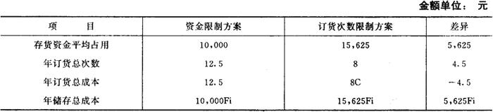 表中c为存货每次订货成本,Fi为存货储存费用率。当资金限额为10,000元时,年订货次数为12.5次;当年订货次数限额为8次时,资金占用量则增加到15,625元。由于可见,限制资金总量,会使年订货成本增加4.5C,而限制年订货次数,则会使年储存成本增加5,625Fi。因此,在进行方案选择时,应对4.5c与5,625Fi的大小进行比较,从中选择使存货成本较低的限制条件方案。具体进行比较、判断和选择的方法如下: 当5,625Fi>4.5C,即Fi>0.0008C时,应选择限制资金总量的方案; 当Fi<0.0008C时,应选择限制年订货次数的方案。 在上例中,如果企业要求资金限额在100,000元至15,625元之间,年订货次数在8次至12.5次之间确定一个合理的、适合企业实际情况的采购批量,则可以按照这两个方案的资金占用量的平均值或年订货次数的平均值加以选择。如以资金占用量为限制条件,即以