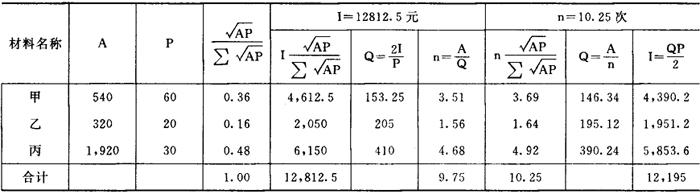 假定以上每一种材料的订货成本与储存成本相等。企业用于三种材料的资金限额为10000元。试对甲、乙、丙三种材料的经济采购批量和年订货批数进行决策。 根据各材料年需要量和单价分配资金限额,并确定年订货次数与经济采购批量的具体计算方法如下表: 经济采购批量及订货批数计算表