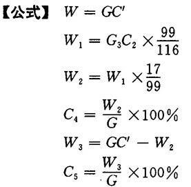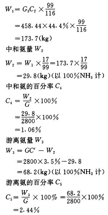 式中 W——每球所需总氨量(kg) G——每球装绝干原料量(kg) C′——每球总氨量(%) W1——每球亚铵液中的亚氢铵量(kg) W2——转变亚氢铵为亚铵时所需NH3量,即中和氨量(kg) C4——中和氨的百分率(%) W3——游离氨量(kg) C5——游离氨的百分率(%) 其它同上。 【例3】在例1和例2中,已知每球总氨量为3.5%,求中和氨和游离氨用量。 解:每球总氨量W W=GC′=2800×3.5=98(kg)(以100%NH3计) 每球亚铵液中的亚氢铵量W1