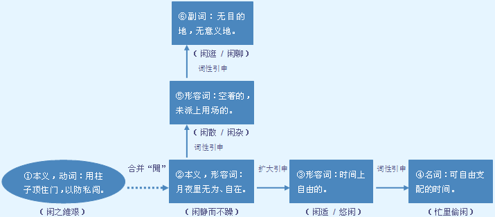 | 释义 | ![]() ❶ 没有事情要做;有空: ~情逸致|~得无聊|游手好~|在家~了好多天|等~下来去串串门。 忙 máng 他是无事~|你这是越帮越~|一双手~不过来|昨晚~得整夜没睡。 ❷ 无事可做的时候: 农~|忙里偷~。 忙 máng 农~|~中出错。 没有事;没有活动;有空(跟“忙”相对)。可受程度副词修饰。 a.作谓语,可带补语。 我这会儿又太~了|张大妈正~着|我什么时候这样~过?|因为停电,我们在车间~了大半天了。 b.作状语。 他常常~坐在屋里出神。 c.作宾语。 退休以后,我又觉得太~了。 (房屋、器物等)被放置而未使用。 a.作谓语,可带宾语、补语。 别让这块地~着|提包~着,我拿去用吧|人可以轮流休息,但不要~着机器|这间屋子~了一个多月了。 b.作定语,或构成词组作定语,要带“的”。 这些都是~着的工具|~了几个月的锄头全锈了。 c.作状语。 他出差几个月,自行车一直~放着。 闲空儿。可用在固定词组中,或用作语素构成合成词。 忙里偷~|农~|偷~|得~|消~。 【近】 〈形〉〈动〉空 【反】 〈形〉忙 【词语】 闲扯 闲荡 闲工夫 闲居 闲空 闲逛 闲气 闲钱 闲情逸致 闲人 闲散 闲事 闲适 闲书 闲谈 闲庭 闲暇 闲心 闲杂 闲章 闲职 闲置 字源解说 本 字“闲” 閑,金文 合并字“閒” “间”与“閒”同源,后分化。閒,金文 闲 文言版《説文解字》:閑,闌也。从門中有木。 闲 白话版《说文解字》:闲,木欄。字形采用“门、木”会义,表示门中有木。 閒 文言版《説文解字》:閒,隟也。从門,从月。 閒 白话版《说文解字》:閒,空隙。字形采用“门、月”会义。 引申线索 ![]() 字源解说 “間”与“閒”同源,后分化。閒,金文 附 文言版《説文解字》:閒,隟也。从門,从月。 附 白话版《说文解字》:閒,空隙。字形采用“门、月”会义。 引申线索 ![]() 【字族索引】 闲 【同音字】 xián |