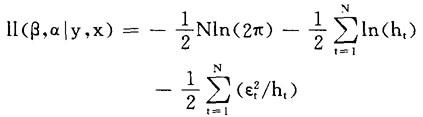 其中q>0;α0>0,αi≥0,i=1,…,q; 当且仅当α(1)<1时,由(1)和(2)定义的ARCH(q)过程是宽平稳的,其均值E(εt)=0,无条件方差V(εt)=α0(1-α(1))-1且协方差cov(εt,εs)=0,t≠s。 设样本有N个观察个数,则模型估计的对数似然函数为:
